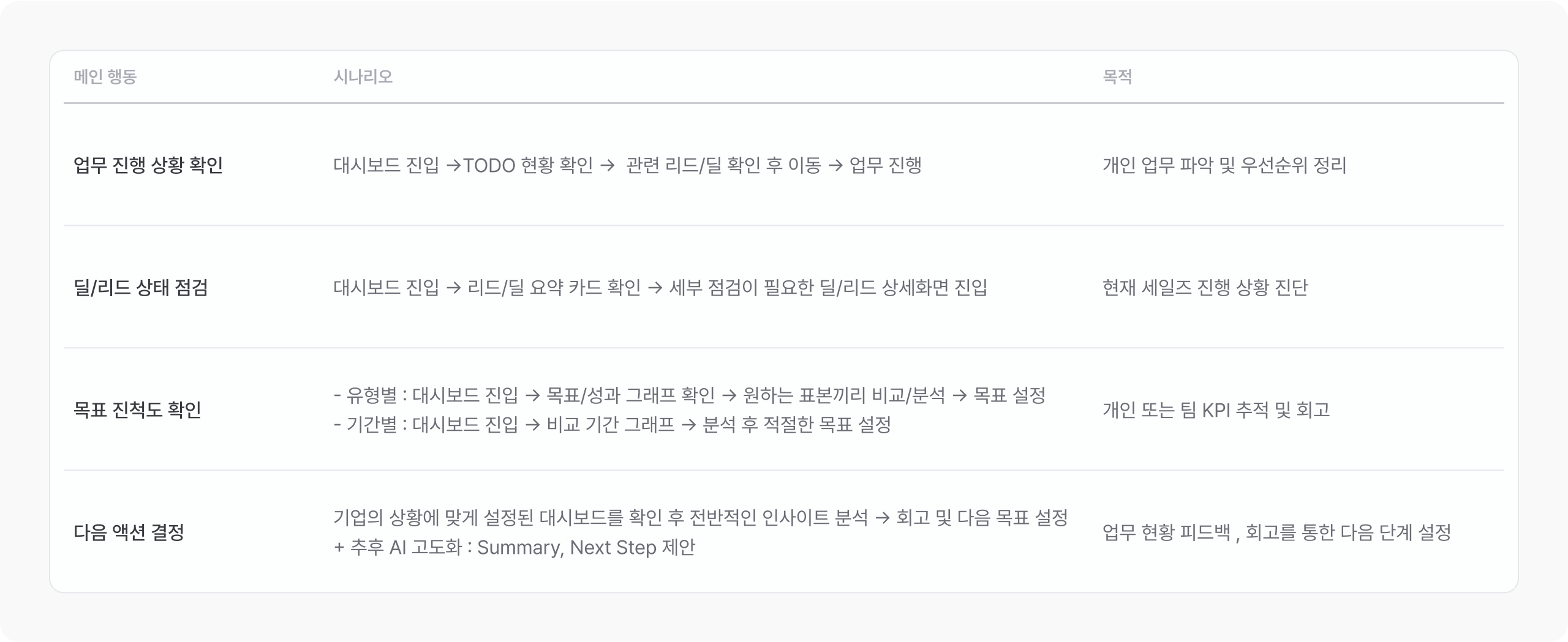 세일즈 담당자, 마케터, 관리자 등 주요 사용자 그룹의 맥락을 정리하고 대시보드의 사용 목적을 정의했습니다.